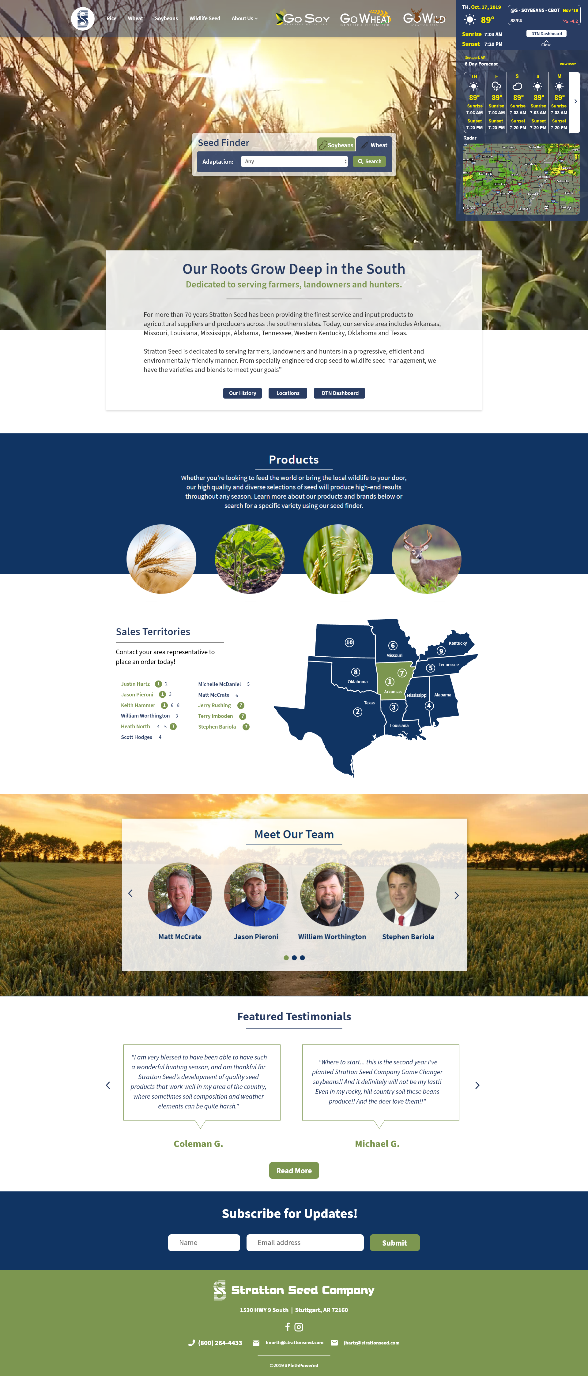 As we developed branding for Stratton Seed, we had the opportunity to make some major design and user experience changes to their website. We started by updating the site colors to match their brand and then moved on to overhauling and re-developing some key features for the site including their DTN capabilities and seed tables. We also developed and added new features to the site such as a subscribe section that links all submissions to their mailchimp account. Other items we completely re-designed include the products section, territory map, history page, and more. By the time we were done, although the layout mostly stayed the same, the site looked and felt completely different while offering users a better experience while moving throughout the site.